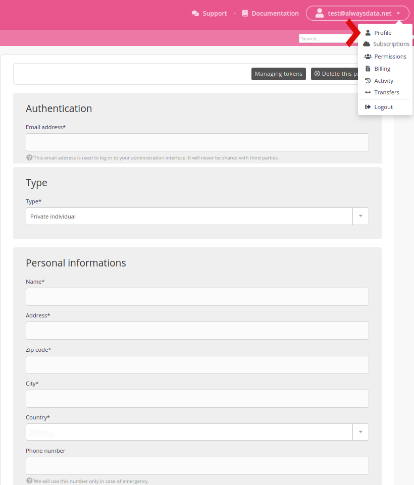 All the information on your profile can be edited, regardless of the authentication level for the alwaysdata administration interface (email address, password) or the property (company name, name, address). The subsequent invoices will be produced using the new profile information.