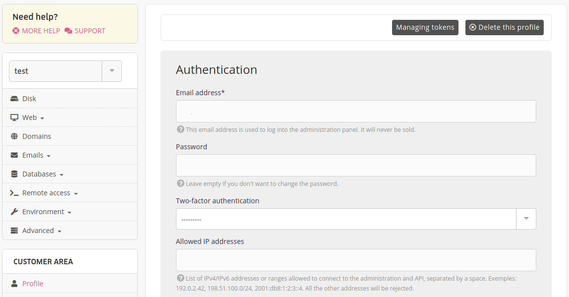 To allow access to the alwaysdata administration interface by some IP addresses only, go to Profile.