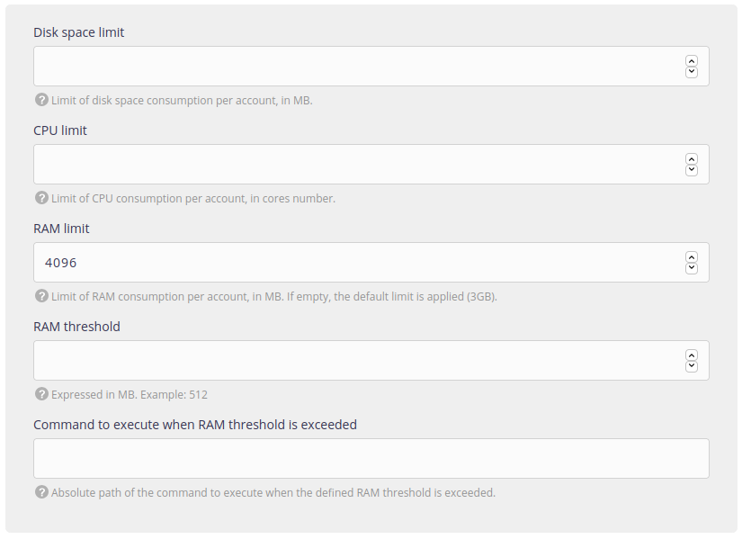 The Resources menu allows to configure sysadmin resources, as the disk space, CPU or memory: