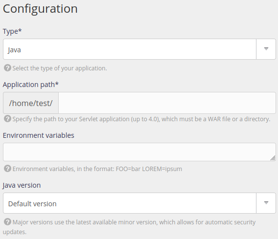 To deploy an HTTP application with Java, create a site in the Web > Sites section. You can choose between two types: