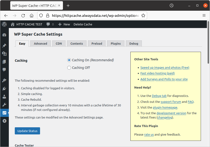 - Install the WP Super Cache plugin in the WordPress administration interface. Activate it, then the cache in its settings: