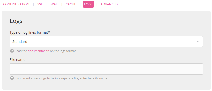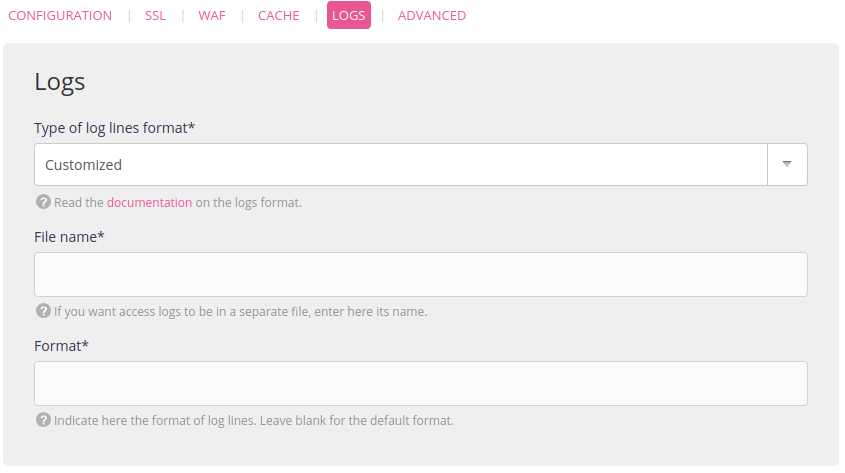 - Customized format. The log lines are customized in the Format field. This field accepts character strings as well as a number of variables listed below.