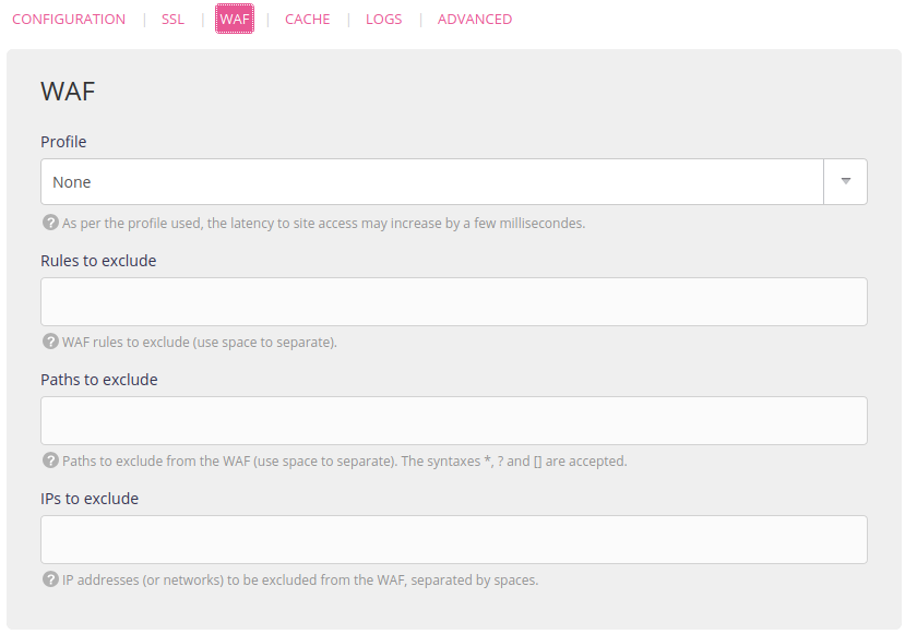 Use the administration interface from Web > Sites > Edit the [site] - ⚙️ > WAF.