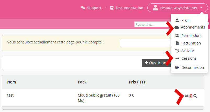 Rendez-vous sur Abonnements > Céder à un autre utilisateur. Vous devrez indiquer l’adresse email du profil destinataire qui pourra alors l’accepter dans l’onglet Cessions de son interface client.