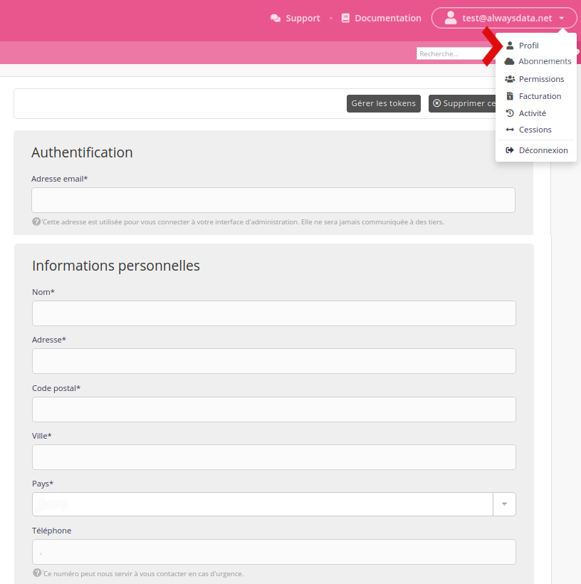 Toute information de profil peut être modifiée que ce soit au niveau de l’authentification à l’interface d’administration alwaysdata (adresse email, mot de passe) ou de la propriété (raison sociale, nom, adresse). Les prochaines factures seront émises avec les nouvelles informations de profil.
