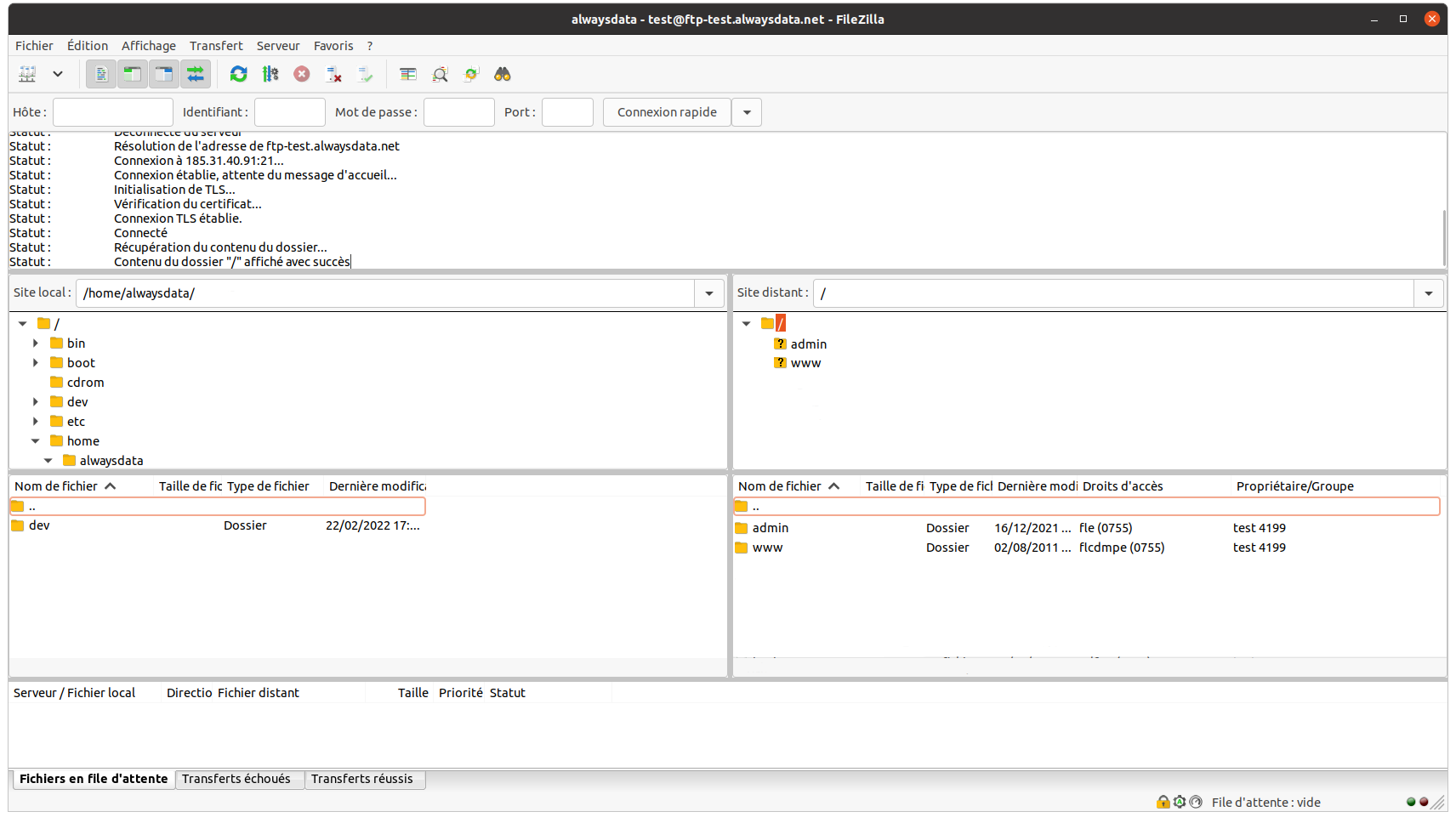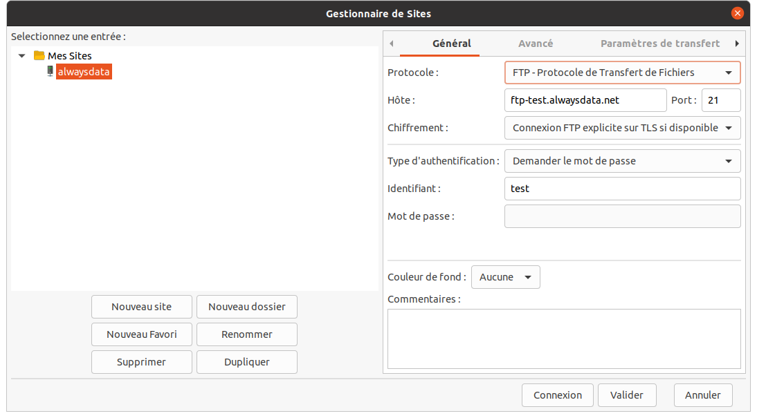 Dans notre exemple nous utilisons le compte test et son utilisateur FTP principal. C’est à remplacer par vos informations de connexion personnelles.