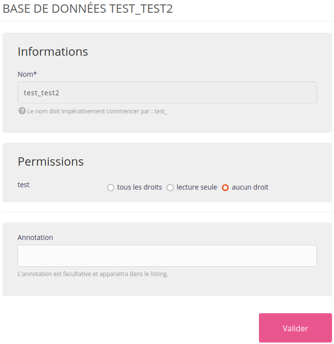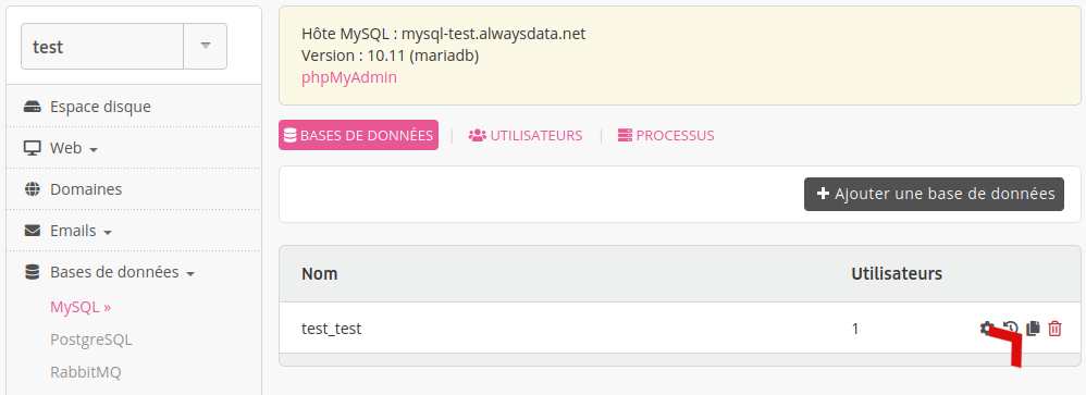 À la création de cette nouvelle base, aucun utilisateur du compte n’a de droit dessus. Il faudra choisir les permissions pour chaque utilisateur du compte via Bases de données > [SGBD] > Modifier [la base voulue] - ⚙️.