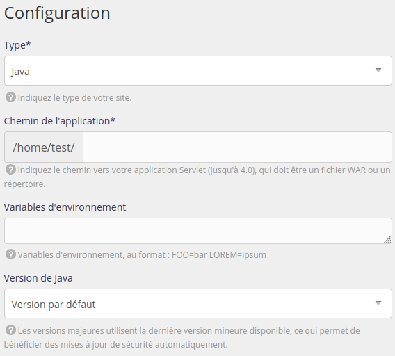 Pour déployer une application HTTP avec Java, vous devez créer un site dans la section Web > Sites et pouvez utiliser deux types de sites :
