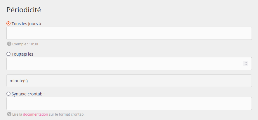 - la périodicité de votre tâche : vous pouvez spécifiez une heure fixe, ou un intervalle