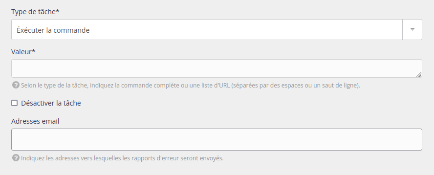 - la (les) commande(s) que vous souhaitez exécuter, ou les URLs que vous souhaitez requêter. Des adresses email peuvent aussi être renseignées pour recevoir les rapports d’erreurs1 (séparées par un espace).